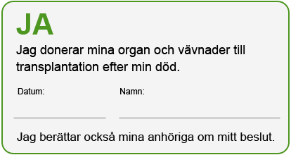 Det finns inte något officiellt eller rätt sätt att uttrycka sin donationsvilja. Det viktigaste är att någon har vetskap om din donationsvilja. Du kan anteckna din donationsvilja på ett papper till exempel på det här sättet. Ha pappret med dig och berätta för dina anhöriga och närstående om det.
