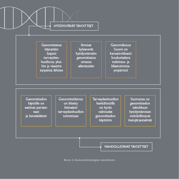 Jotta kaikilla ihmisillä olisi yhdenvertainen mahdollisuus hyötyä genomitiedosta, sosiaali- ja terveysministeriön asettama työryhmä on laatinut ehdotuksen kansalliseksi genomistrategiaksi. Keväällä 2015 julkaistussa strategiassa esitellään keskeiset toimenpiteet, joilla varmistetaan genomitiedon tehokas hyödyntäminen terveydenhuollossa sekä terveyttä ja hyvinvointia edistävässä päätöksenteossa vuonna 2020.