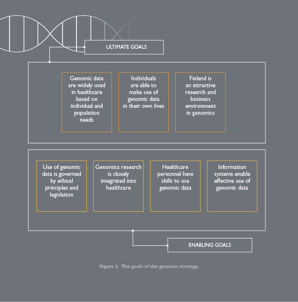 Everyone must have an equal opportunity to benefit from genomic data. Therefore, a working group of the Ministry of Social Affairs and Health has drawn up a proposal for a National Genome Strategy. The strategy was published in spring 2015. It sets key measures for ensuring that, by 2020, genomic data will be effectively used in healthcare and in the promotion of health and wellbeing.