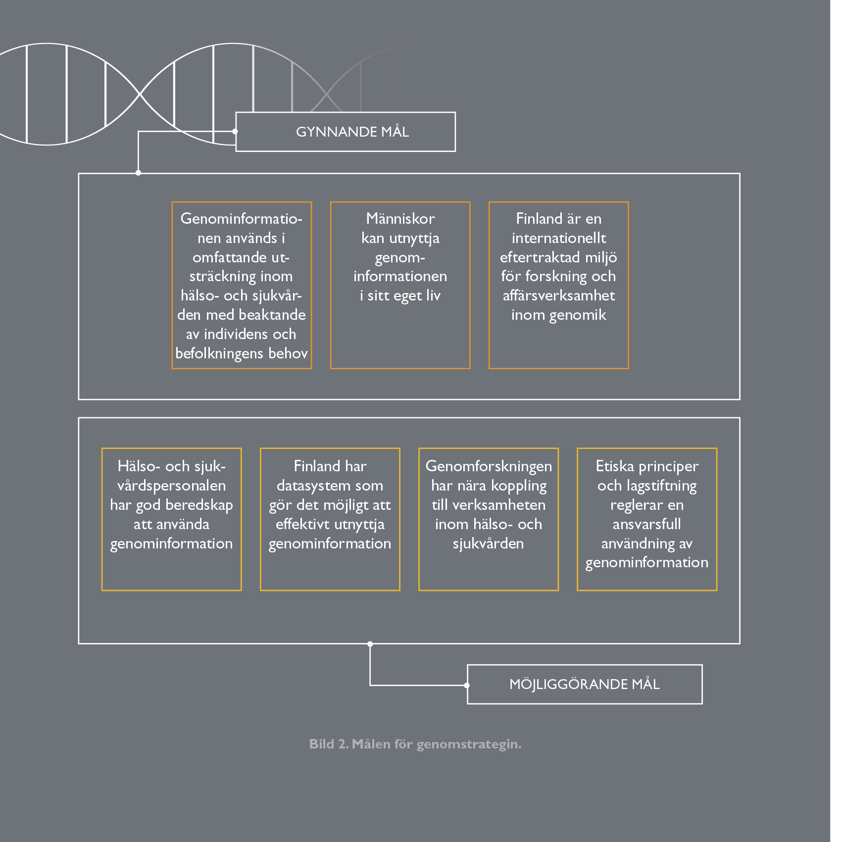 För att alla människor ska ha lika möjligheter att dra nytta av genominformationen har en arbetsgrupp tillsatt av social- och hälsovårdsministeriet utarbetat ett förslag till nationell genomstrategi. I strategin, som publicerades våren 2015, presenteras centrala åtgärder för att säkerställa att genominformation år 2020 utnyttjas effektivt i hälso- och sjukvården och i beslutsfattande som främjar hälsa och välmående.
