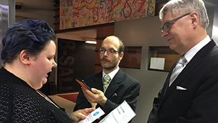 | Viestintätiimin Janne Tavast ja Kirsi Muhonen haastattelevat Lahden kaupunginjohtaja Jyrki Myllyvirtaa. |