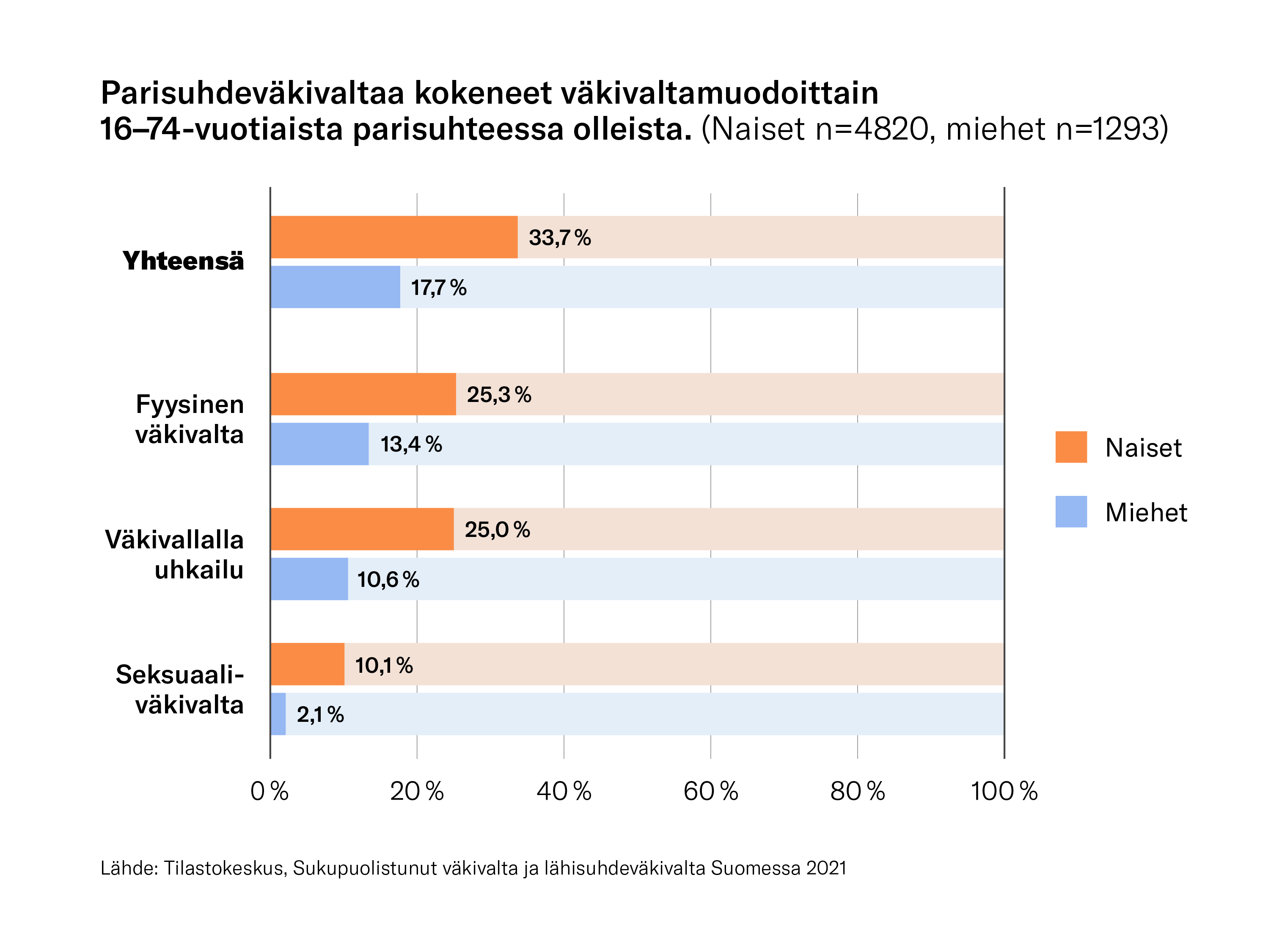 Viimeisimmän väestötason tutkimuksen mukaan 34 prosenttia suomalaisista naisista on elämänsä aikana kokenut väkivaltaa nykyisen tai entisen kumppaninsa taholta. Tämä hälyttävä luku kertoo ilmiön laajuudesta. Monet parisuhdeväkivallan uhrit ovat todistaneet väkivaltaa myös lapsuuden perheessään. Pari- ja lähisuhdeväkivaltaa kokevat myös miehet.