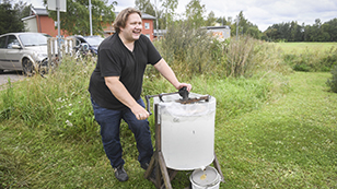 | Työttömien Ay-Jäsenten Tukiyhdistys TATSI ry:n toiminnanjohtaja Jouni Gustafsson pääsi pyörittämään hunajalingon kampea Porvoon Yhteisen keittiön Sadonkorjuujuhlassa |