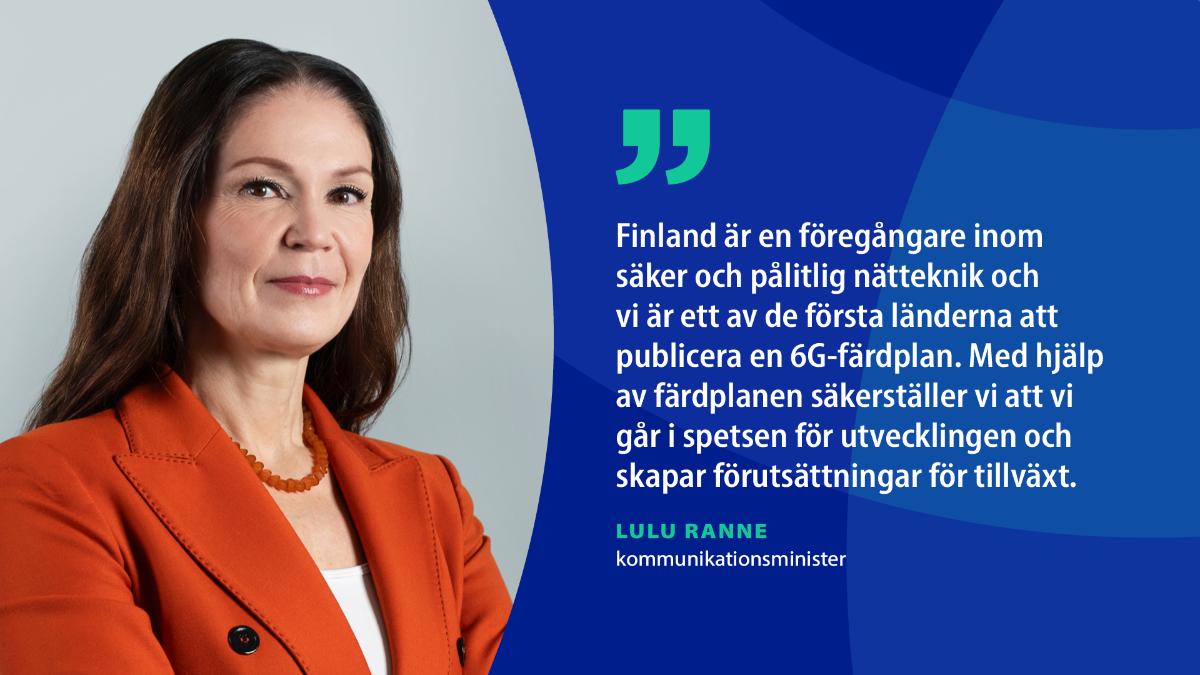 - Finland är en föregångare inom säker och pålitlig nätteknik och vi är ett av de första länderna att publicera en 6G-färdplan. Med hjälp av färdplanen säkerställer vi att vi går i spetsen för utvecklingen och skapar förutsättningar för tillväxt, säger kommunikationsminister Lulu Ranne.
