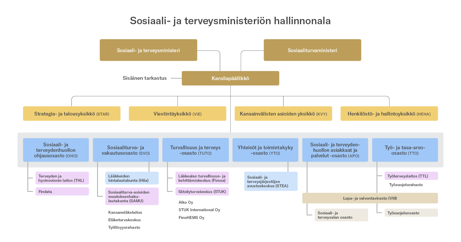 STM vastaa sosiaali- ja terveysalan sekä työsuojelun ohjauksesta ja tulostavoitteiden määrittelystä osana tulossopimusta.