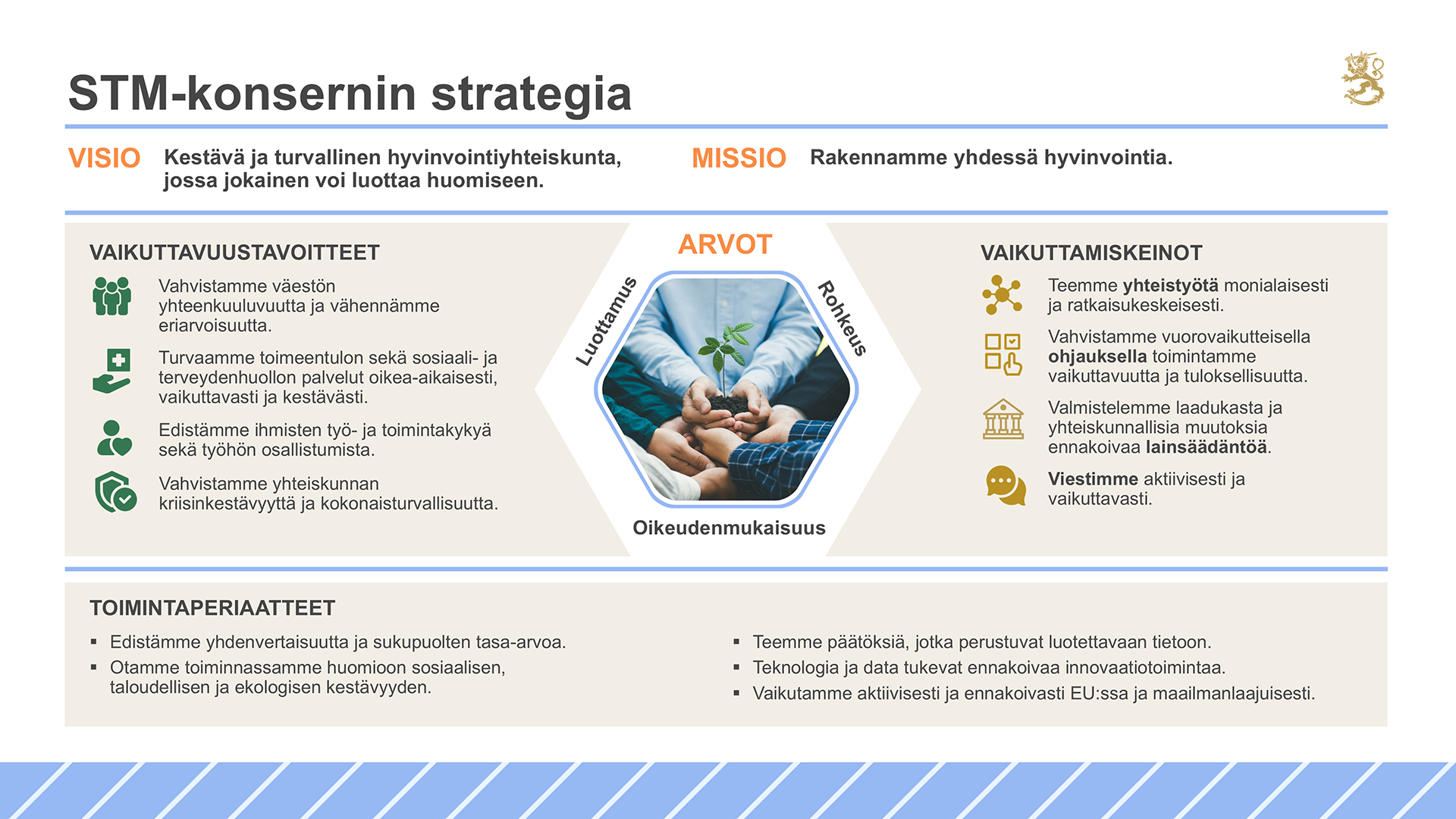 - Luottamus: toimimme avoimesti, osallistavasti ja yhteistyöhakuisesti edistäessämme eheää ja turvallista yhteiskuntaa.