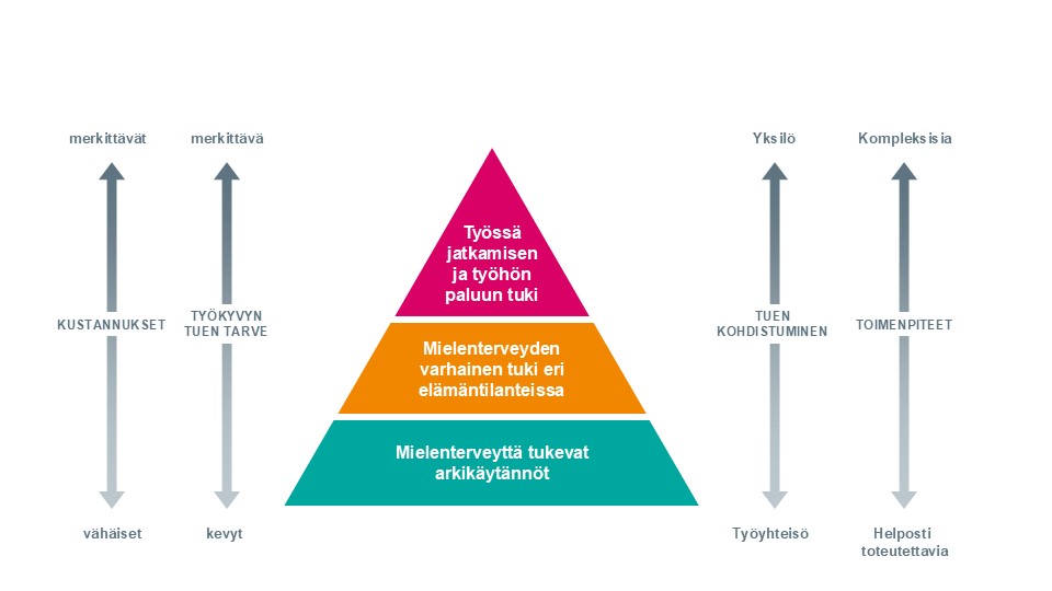 Ennaltaehkäisevät ja mielenterveyttä edistävät kehittämistoimet kohdistuvat koko työyhteisöön ja niistä hyötyvät kaikki. Vasta ongelmiin reagointi tai ainoastaan yksilötason työkykyhaasteisiin reagointi tulee kalliimmaksi ja johtaa työpanoksen menetyksiin, kuten sairauspoissaoloihin tai tuottavuuden laskuun. Kun työhyvinvointi kohenee, tuottavuus lisääntyy.