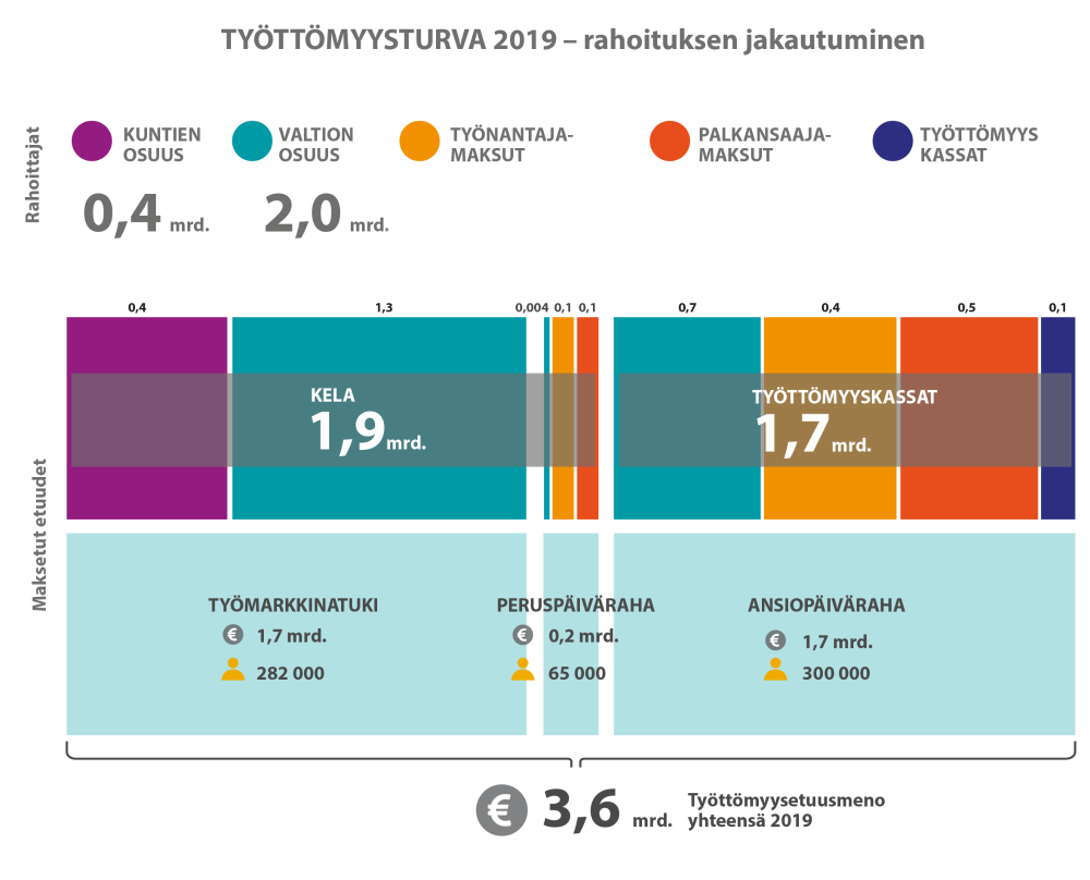- Työttömyysturva koostuu peruspäivärahasta, ansiopäivärahasta ja työmarkkinatuesta.